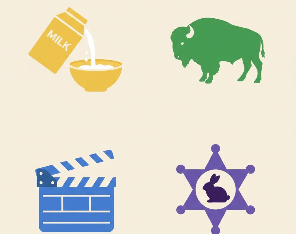 Illustration of the NYT Connections grid for Jan 26, featuring icons for a Badge, a Cow, a Film Reel, and a Milk carton representing the puzzle themes.